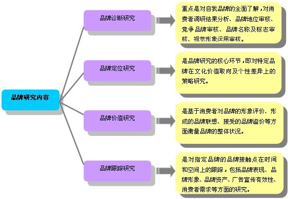 品牌是一種名稱、屬于、標(biāo)記或他們的組合運(yùn)用,借以辨認(rèn)某一銷售者或其產(chǎn)品/服務(wù),并使之同競(jìng)爭(zhēng)對(duì)手的產(chǎn)品和服務(wù)區(qū)分開(kāi)來(lái)。品牌研究是采用科學(xué)的市場(chǎng)指標(biāo)評(píng)價(jià)和價(jià)值觀評(píng)價(jià)方法,洞察消費(fèi)者對(duì)品牌的全面體驗(yàn)、感受與評(píng)價(jià),包括對(duì)產(chǎn)品功能、使用環(huán)境、使用者、制造商與經(jīng)銷商特點(diǎn)等等方面。